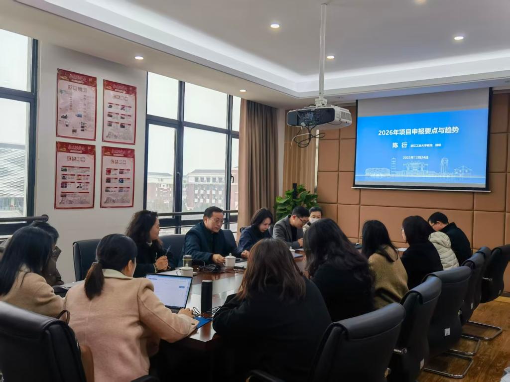 为精准把握2026年社科类项目申报要点,明晰学科发展趋势,提升我校科研人员项目申报质量与撰写水平,12月24日,我校特邀请浙江工业大学陈衍教授来校开展专题交流活动。校长余闯、副校长杨晓珍及职业教育等相关社科类研究人员参与。
